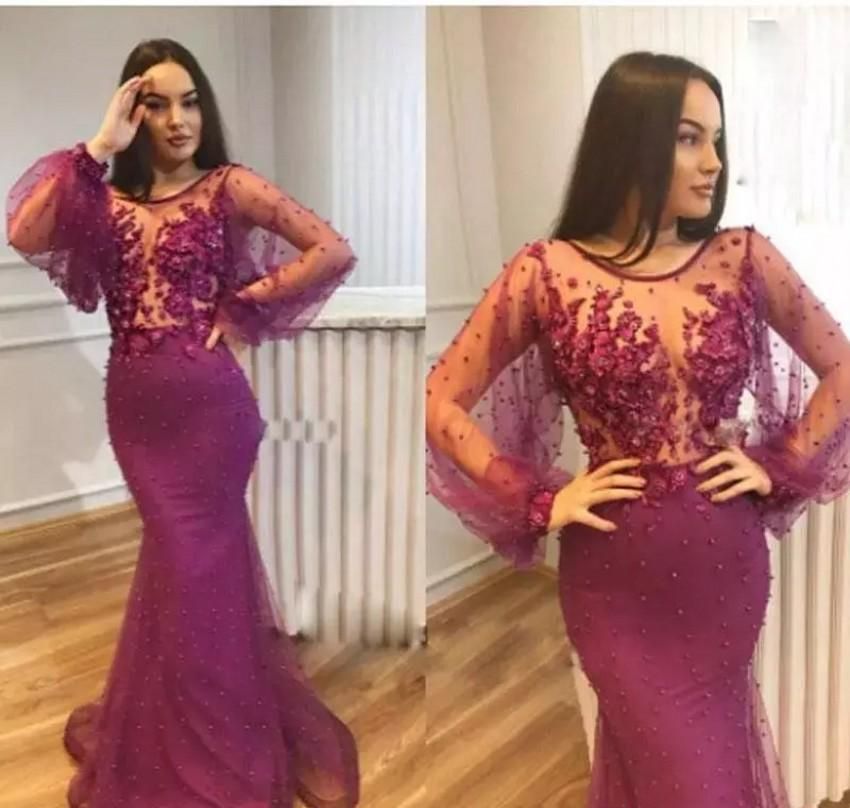 2020 Red Sheer Long Sleeves Prom Dresses Mermaid Appliqued