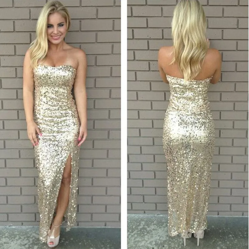 Dress Gold Sequins Prom Glitter Beautiful Long Tight Slit