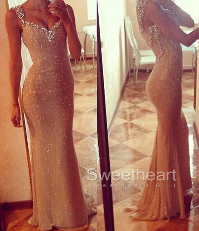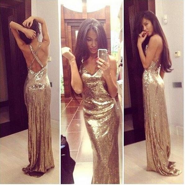 Long Tight Gold Sequin Prom Dress V Neck Backless Sexy Formal