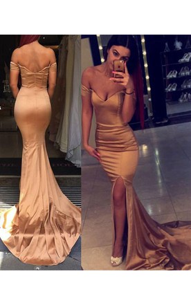 Simple Rose Gold Mermaid Tight Prom Dresses Off The Shoulder Front