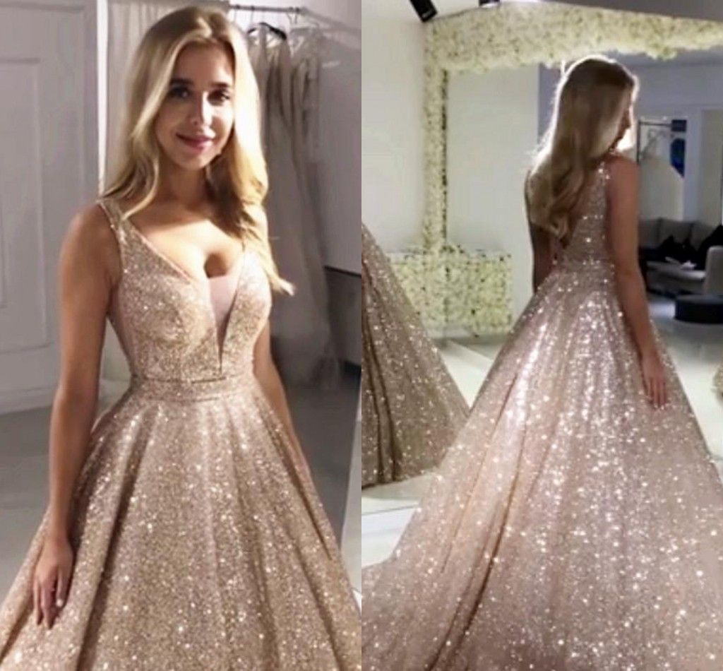 Expensive Rose Gold Sequined Prom Evening Dresses Sexy V Neck V