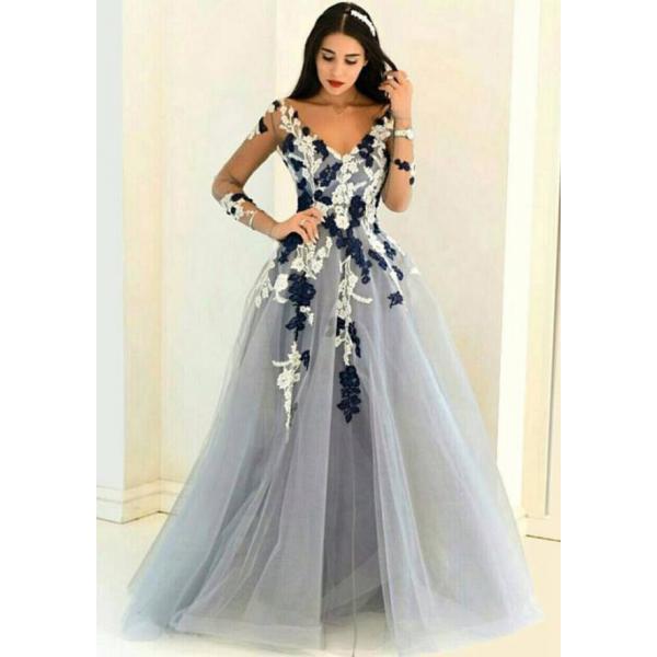 Shop 2019 Princess V Neck Long Sleeves Gray Lace Chiffon Prom Dresses