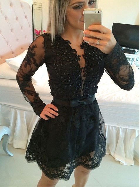 Princess Long Sleeve Short Prom Dress Black Lace Prom Gowns Prom