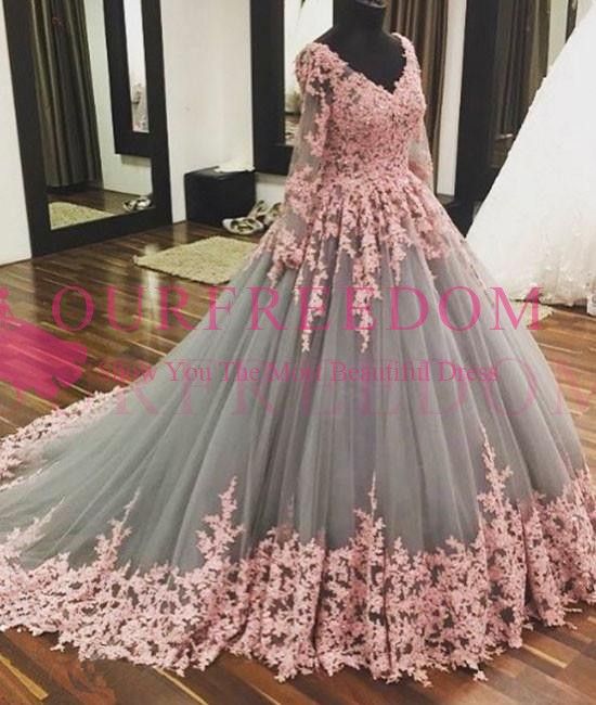 Grey Wedding Dress Long Train Princess Prom Dress Long Sleeve