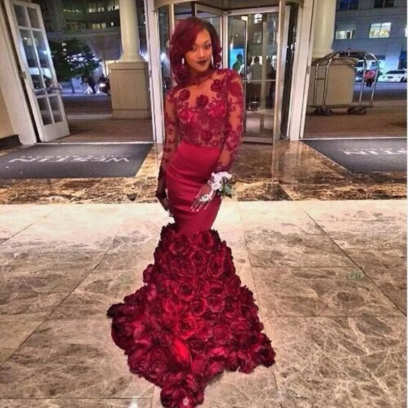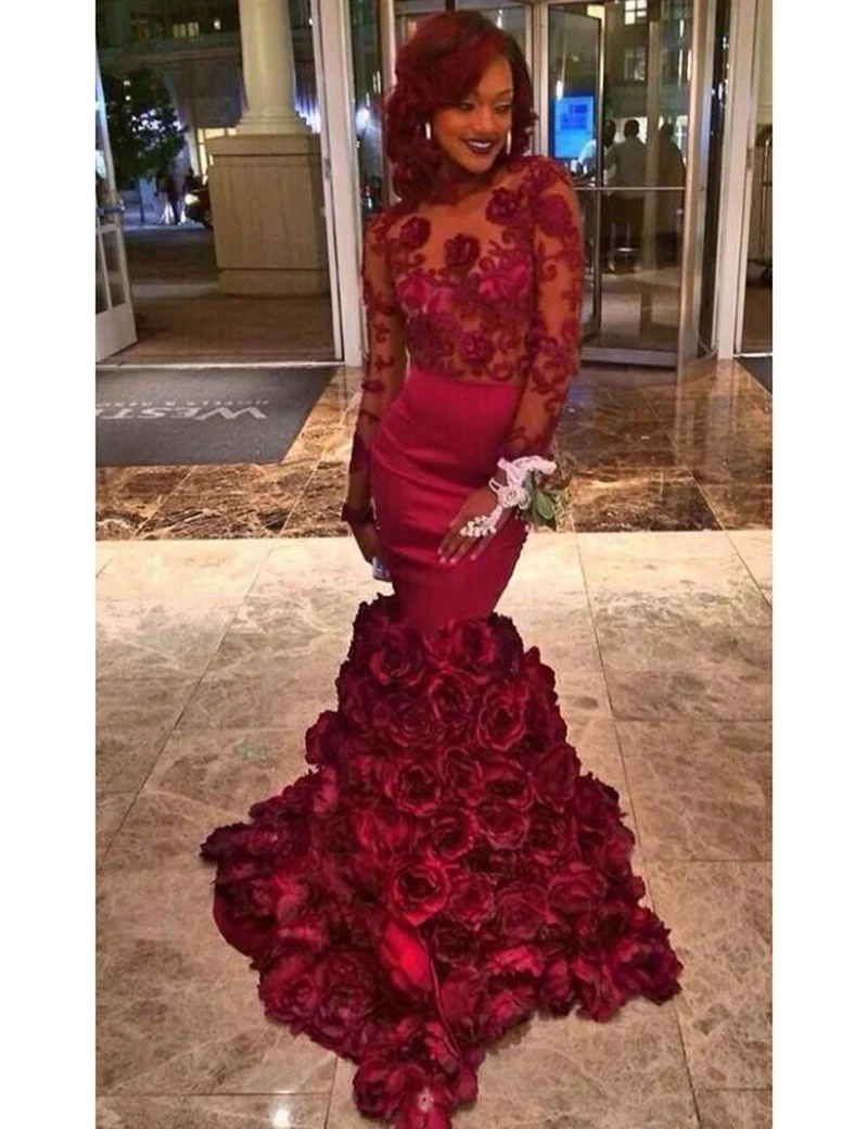 Mermaid Lace Appliques Burgundy Prom Dress Long Sleeves Prom