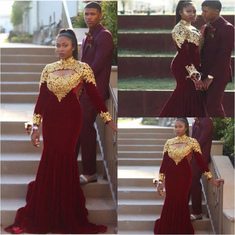 2018 African Plus Size Prom Dresses Long Sleeve Burgundy Velvet