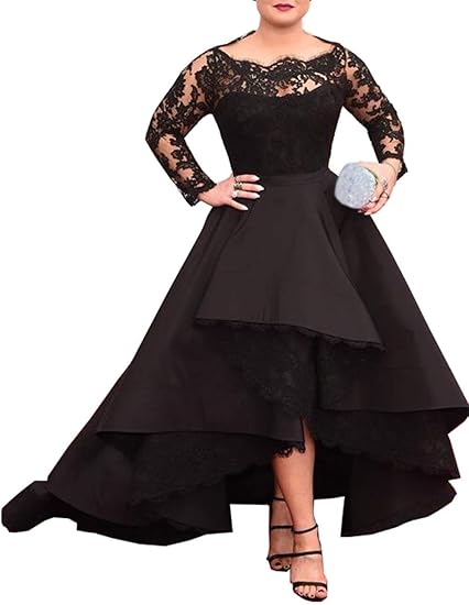 Hi Lo Lace Long Sleeves Lace Prom Dresses Plus Size Black Plus