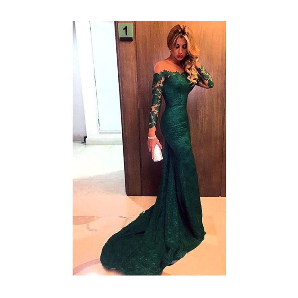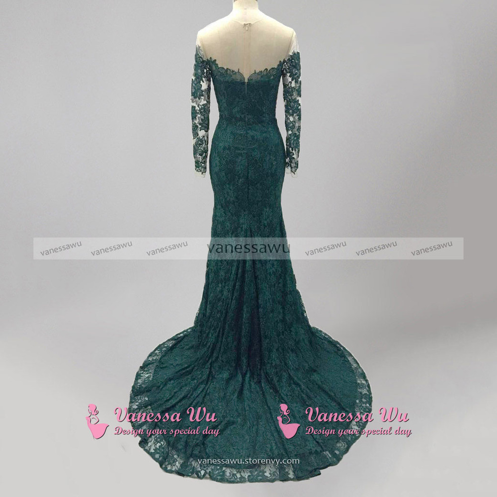 Emerald Green Lace Prom Dress Long Sleeve Mermaid Prom Dress Off