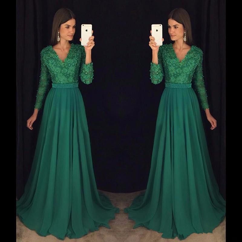2k17 Spring Chiffon Emerald Green Long Sleeves A Line Prom Dresses