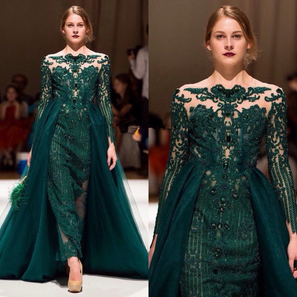 Emerald Green Mermaid Evening Dress Long Sleeve Detachable Train