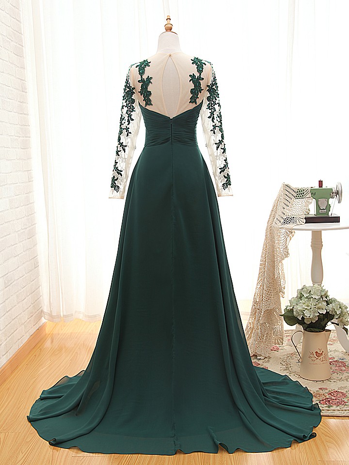 Emerald Green Sheer Long Sleeve Lace Prom Dress With Chiffon