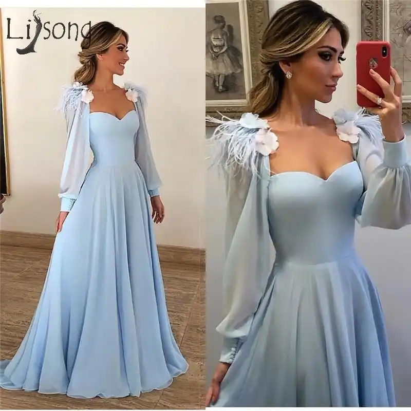 Modest Light Blue Feather Evening Dresses 2019 A Line Long Sleeves