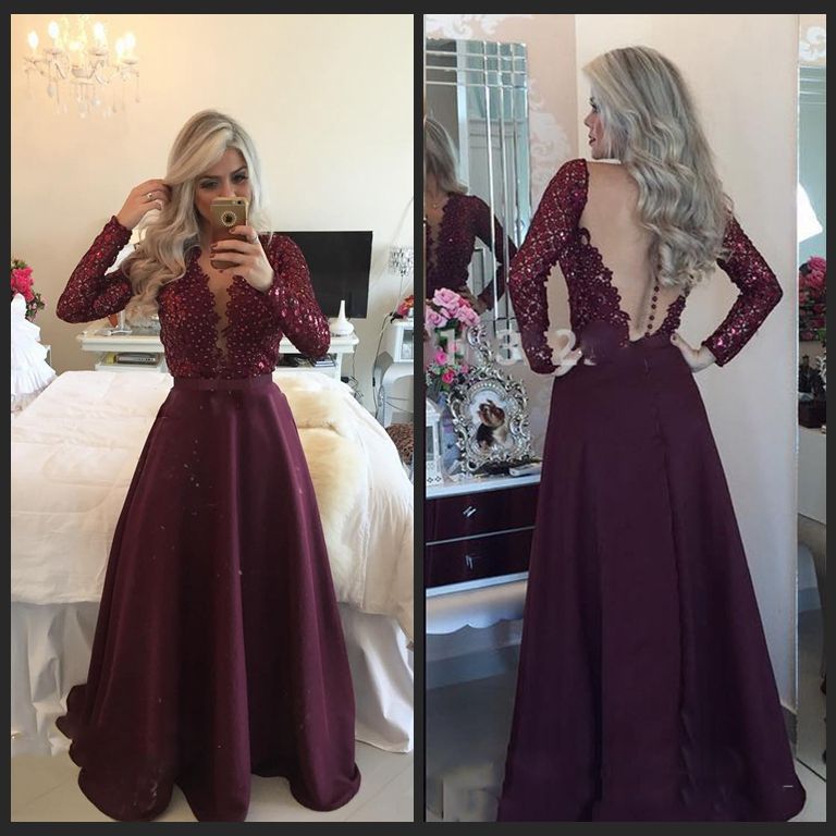 Long Sleeves Maroon Lace Beaded Long Evening Prom Dresses Cheap