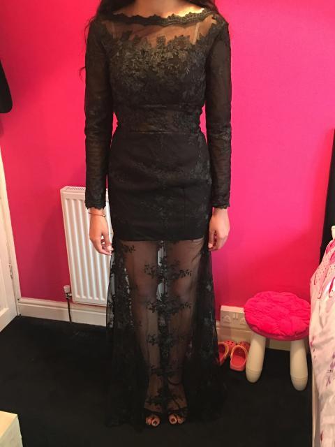 Black Lace Satin Open Back Long Sleeve Prom Gown Promfy
