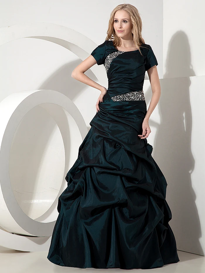 169 99 Long Modest Green A Line Capped Sleeves Zipper Beading