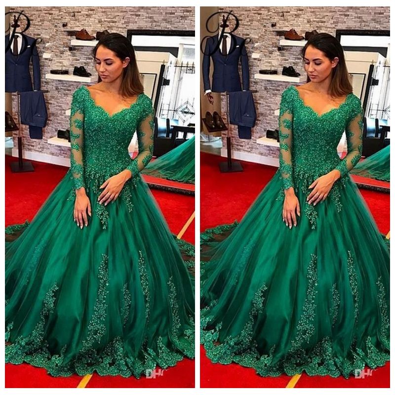 2018 Arabic Modest Green Ball Gown Evening Dresses V Neck Sheer