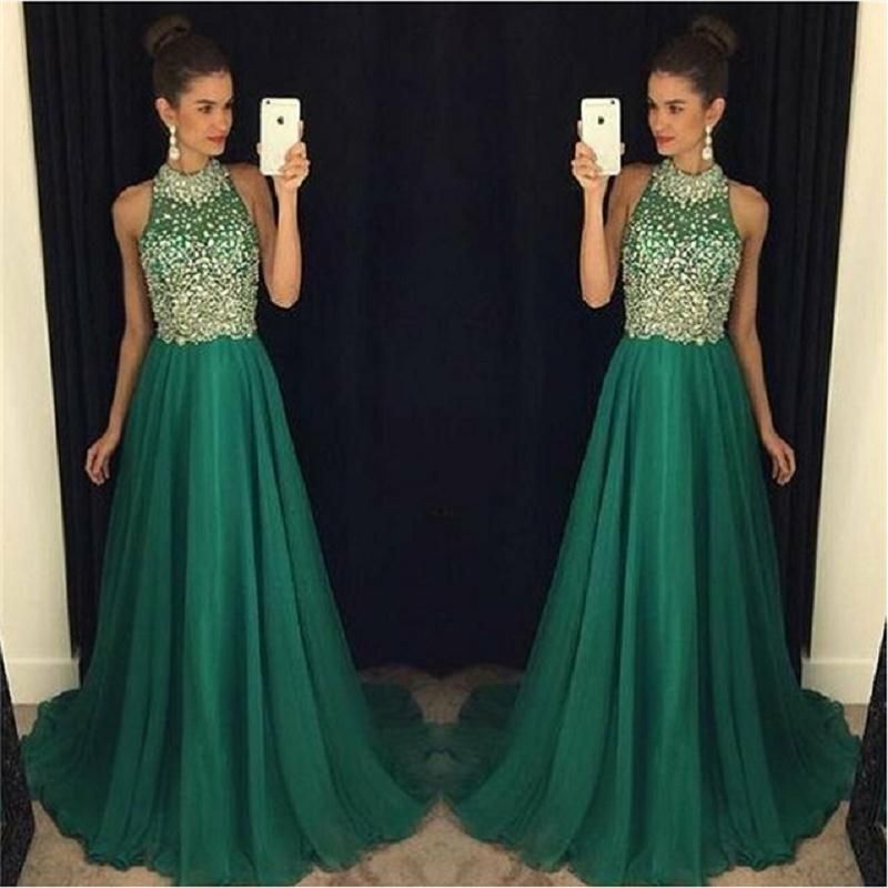 Beaded Emerald Green Prom Dresses 2017 Modest Halter Special