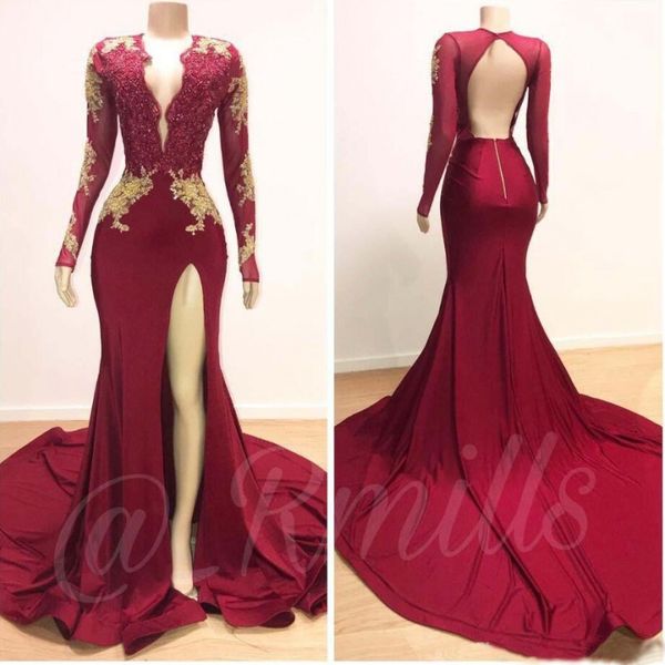 2020 Sexy Prom Dresses Red Long Sleeves Mermaid Rose With Gold