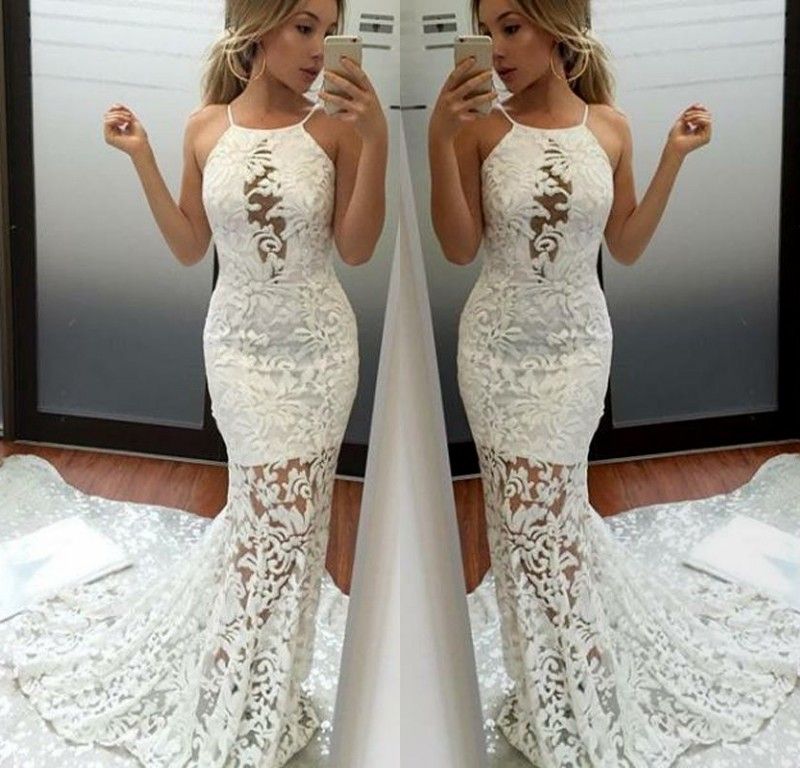 Simple White Long Lace Prom Dresses Jewel Mermaid Evening Gowns