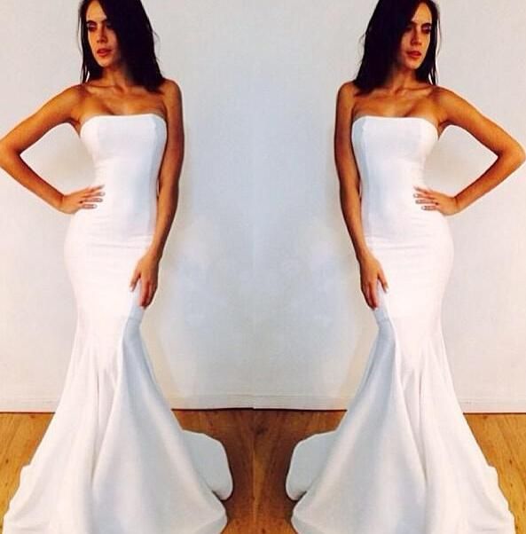 Simple White Long Prom Dresses Strapless Mermaid Satin Sweep Train