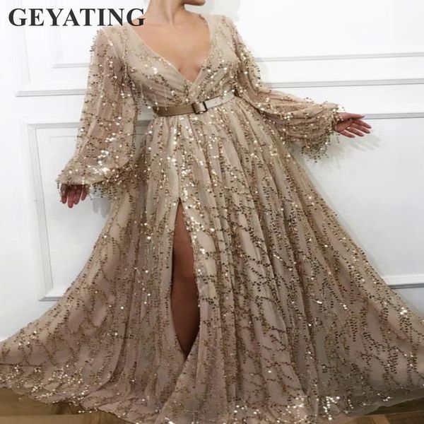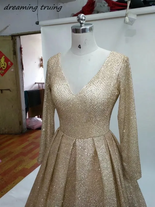 Glitter Sequins Champagne Gold Prom Dresses Long Sleeves Sexy Deep