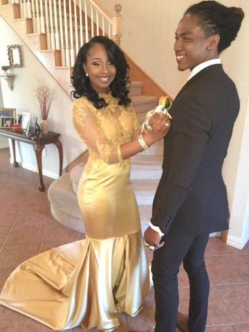 Champagne Gold Trumpet Long Sweep Prom Dresses Long Sleeve 2019