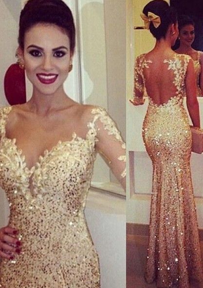 Sparkle Sequined Long Sleeves Mermaid Gold Prom Dresses With Long