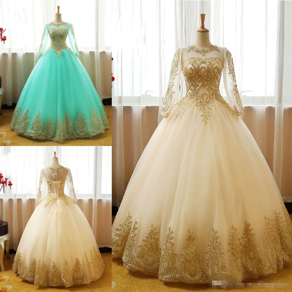 Lace Long Sleeves Prom Dresses Champagne Gold Ball Gown Formal