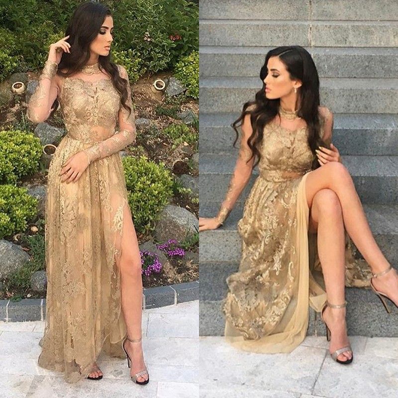 Champagne Gold 2018 Prom Dresses Long Sleeves Illusion Lace
