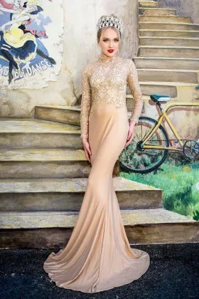 Champagne Gold Lace Appliques Evening Gown Long Sleeve Mermaid