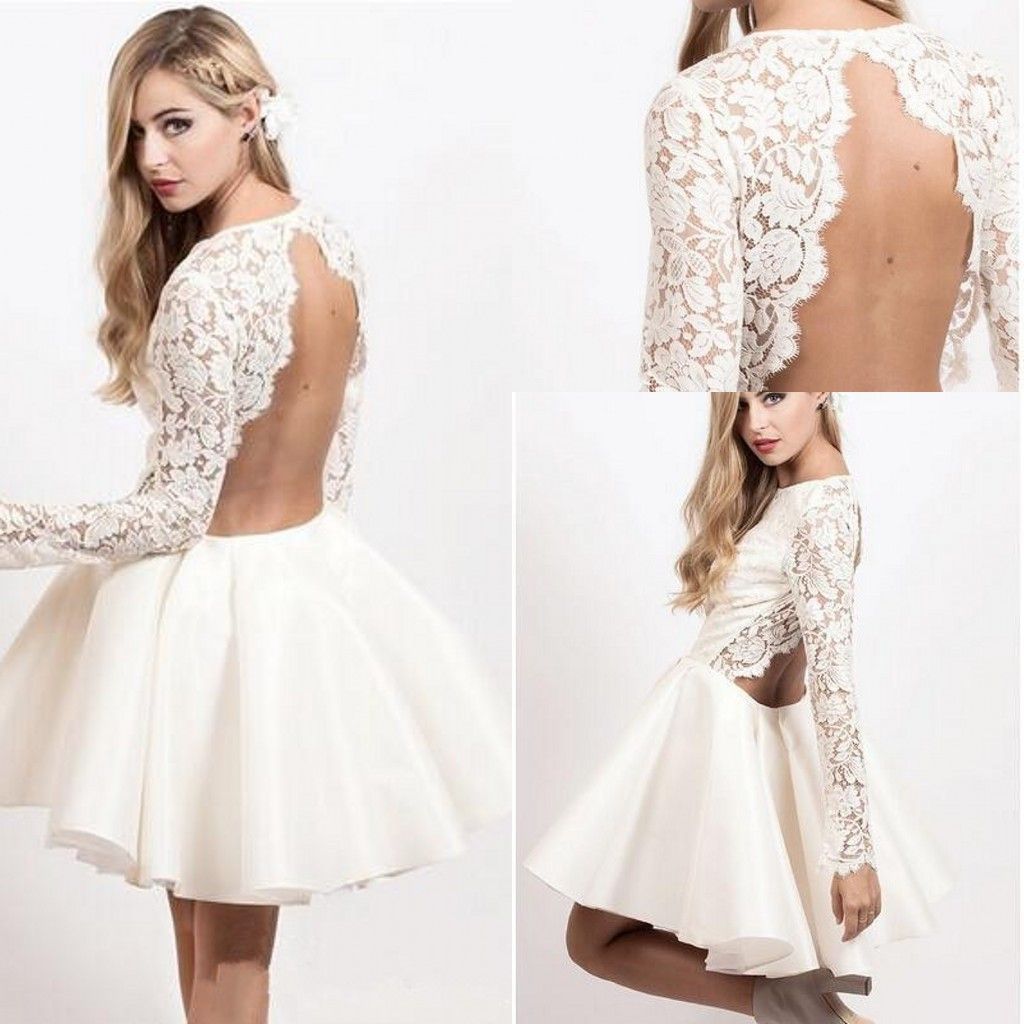 2017 Cheap Sexy Backless White Lace Prom Dresses Long Sleeves Knee