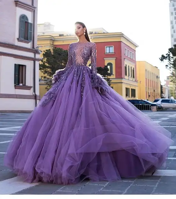 2020 Lavender Ball Gown Prom Dresses Long Sleeve Gorgeous Feather